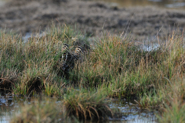 Photo © Y. Dubois / Corif Dans ses grandes lignes, l’habitat en nidification est semblable à celui des sites d’hivernage, avec un couvert d’herbe plus compacte. La bécassine apprécie ainsi les marais, les prairies humides et les landes. De mars à juillet, Elle va mériter son surnom de « chèvre céleste » en pratiquant des vols à chevrotement. Elle s’envole en silence puis fait un circuit en volant à 40° les ailes étalées et la queue déployée. Ses rectrices (plumes de la queue) externes vont vibrer produisant un « houhouhouhou » caractéristique. Les deux sexes pratiquent ce type de vol, qui peut exceptionnellement se produire en dehors de la saison de reproduction. Sa signification est aussi bien sexuelle que territoriale, voir même une simple expression de l’excitation des oiseaux. Ainsi, pour charmer la femelle, le mâle utilise plutôt le vol en feston, il va prendre de la hauteur et se laisser descendre en planant avec les ailes relevées en V et arquées, souvent en se jetant d’un côté sur l’autre, voir en se renversant sur le dos. Si la femelle est intéressée, elle s’envolera à son tour... Après l’accouplement c’est la femelle qui choisira l’emplacement de son nid, qui se trouve au sol, garni d’herbes et de feuilles sèches. Elle y pondra quatre oeufs qu’elle couvera seule pendant une vingtaine de jour, le mâle restant à proximité. Après l’éclosion, le couple se sépare, chacun prenant généralement en charge la moitié des jeunes. Le nid est donc abandonné dans la journée après la dernière naissance. Les parents nourrissent les petits pendant quelques jours puis au bout d’une dizaine de jours ils pourront se nourrir seuls. La famille se séparera dès les premiers vols.